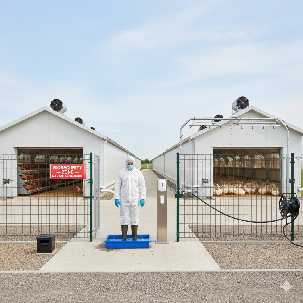 Biosecurity is the implementation of measures that reduce the risk of the introduction and spread of disease. The effective biosecurity measure includes controlled farm entry, strict sanitation, rodent and insect control, proper waste disposal, separation of age groups, and the availability of  clean feed and treated water. Apart from improving poultry health and productivity, biosecurity controls zoonotic pathogens. Further, by adopting strict biosecurity protocols farmers can reduce prevailing antimicrobial resistance problems.