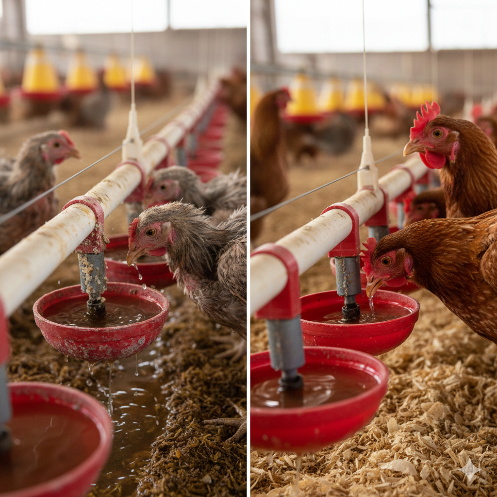 Even the customer formula feed will fail, if the water supplied to the birds is contaminated. This situation will lead to adverse effects, including loose droppings due to microbial load, severely poor nutrient absorption (meaning amino acids, energy, and vitamins are lost). Moreover, this situation will increase prevalence of diseases like E coli and salmonella infection. The poor water quality can also adversely influence bird health and can cause diseases like enteritis and dysbacteriosis. These factors will generally weakened immunity that compromises overall production performance (Saleh et al., 2023).